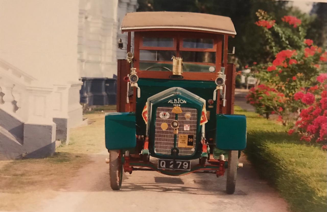 The Albion Motor Car Company was established in 1899 by Thomas B. Murray and Norman Fulton in Glasgow , Scotland . Early products were 2 - cylinder , 8hp ' dog carts ' . The first commercial vehicle appeared in 1902 with a 8hp engine and tiller steering . The Company's well known slogan ' Sure as the Sunrise ' was incorporated into logos and badges . This 1908 lorry is the oldest known running commercial motor vehicle in Sri Lanka . It was first registered in May 1914 to H.L. de Mel , who owned the Bogala Graphite Company . Similar models were used to transport graphite from mines in Kurunegala to Colombo at the maximum speed of 8mph . Many Albion lorries and buses were imported into Sri Lanka . Having performed sterling service for 65 years , it was to be sold in 1979 for scrap . Fortunately , Tilney Peiris , then Assistant Commissioner of Motor Traffic , purchased this as well as a 1925 Albion truck for a sum of Rs . 500 / - . He restored it and competed in rallies . It was then neglected and Hercil Fernando -- the present owner of the vehicle since 1988 – then purchased and restored it to its pristine stat