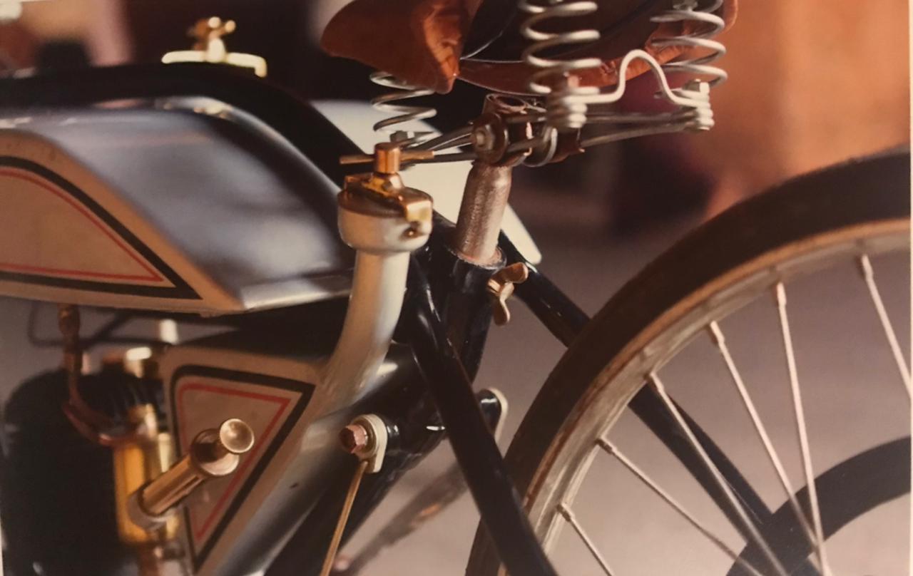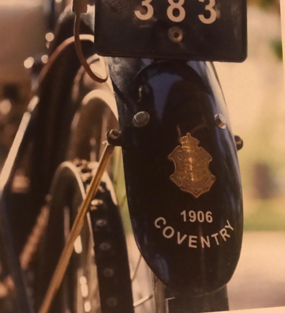 The Triumph Motorcycle company was founded in the 1880s by German immigrant Siegfried Bettmann in Coventry , England , The installation of an auto - motor into the frame of a Triumph bicycle in 1902 created the soon to be famous Triumph motorcycle marque . The Triumph Coventry was launched in 1906 using a new - design engine and the recently invented Bosch Simms high - tension magneto . The frame was redesigned and the new ' Rocking front fork with horizontal springing introduced . While the company went through a number of changes and owners , Triumph Motorcycles has the distinction of being the world's longest continuous production motorcycle manufacturer . Some features typical of early motorcycles are seen on the Triumph Coventry , fuel tank slung beneath the frame top tube ; brass carburettor ; all - brass gas lighting system , manually activated oil pump ; and tyre inflator pump mounted on the frame top tube . Firing up the Triumph Coventry is by foot pedals and chain , the variable gearbox transmitting power through a rubber belt with detachable segments . Braking operates on a hoop , and is on the rear wheel only . This example was found in a small town distant from Colombo , the capital city of Sri Lanka ( former Ceylon ) about nine decades after manufacture . The engine , wheels , and part of the frame , were about all that remained . A two - year restoration - which included a frame rebuild - sees the 1906 Triumph Coventry well into its second century of existence .