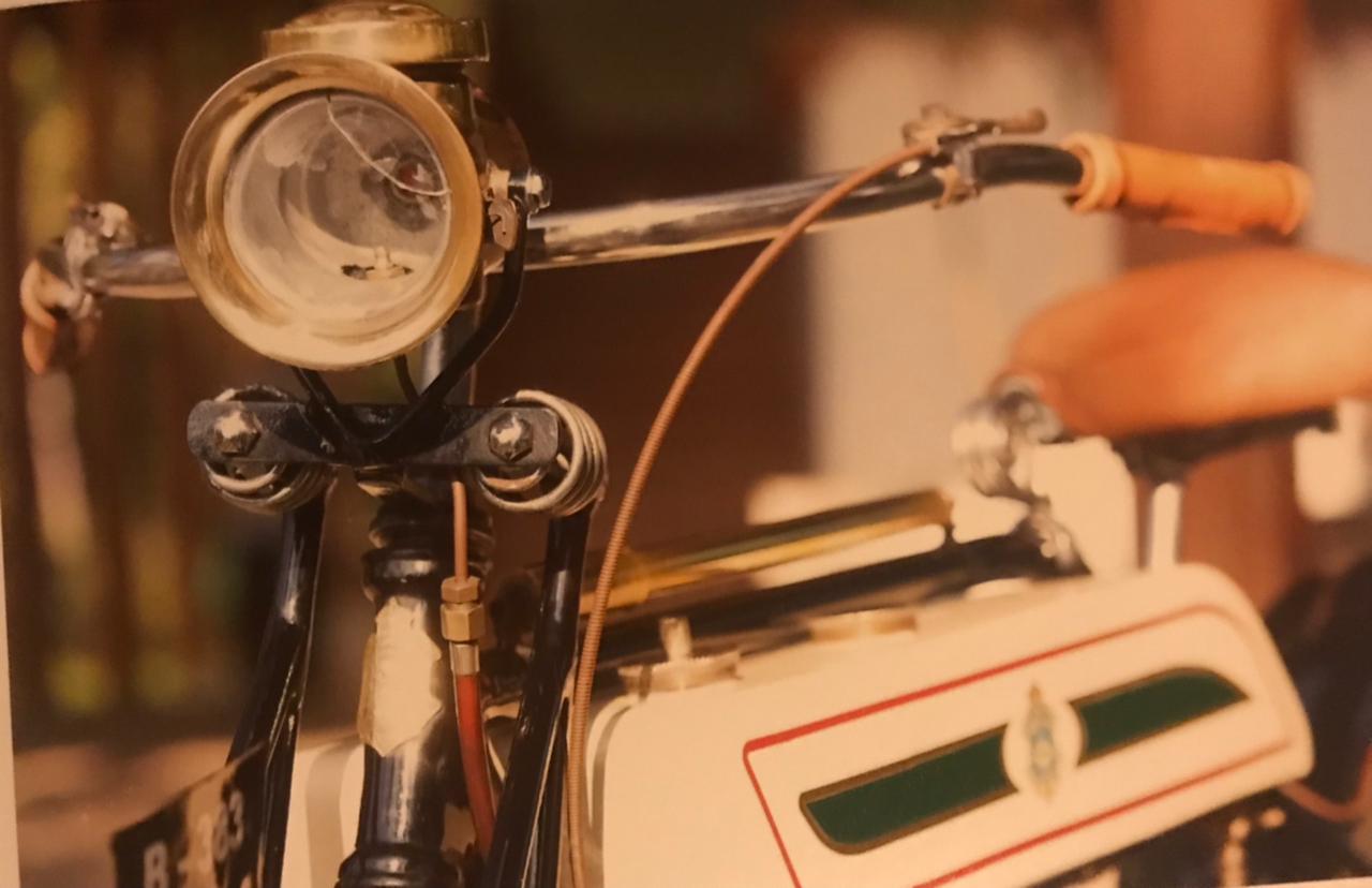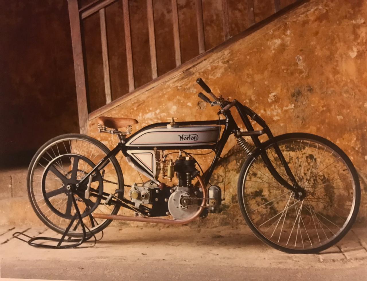 Norton is synonymous with top flight motorcycle racing . The company was founded in 1898. Entering competition in the early 1900s , Nortons carried numerous riders to victory after victory well into the 1960s , and to date - a century later - continues to win races in classic motorcycling . The great handling of the patented ' Featherbed ' frame of 1950 , together with the robust single - cylinder 4 - stroke motors of 350cc and 500cc displacements , made the Norton Manx the must have machine for any race rider of the time , and set the trend for motorcycle design , racing and otherwise . Discovered lying in pieces in a motorcycle workshop off Kurunegala , this 19R was rebuilt from ground up . The Norton 19R TT is a particularly great racer . Purpose built for competition , it has a free - breathing carburettor and straight through exhaust system , quick opening fuel filler cap , a racing type air - cooled clutch , low - swept handlebars , a long fuel tank enabling the rider to position himself for maximum wind - cheating effect , minimalist saddle , and a detachable stand . The total - loss engine lubrication being manual , the rider needed to remember , even under the pressure of racing , to regularly hand - pump oil into circulation or face engine seizure . Horsepower is transmitted through a 3 - speed hand - lever operated Sturmey Archer gearbox and chain final drive .