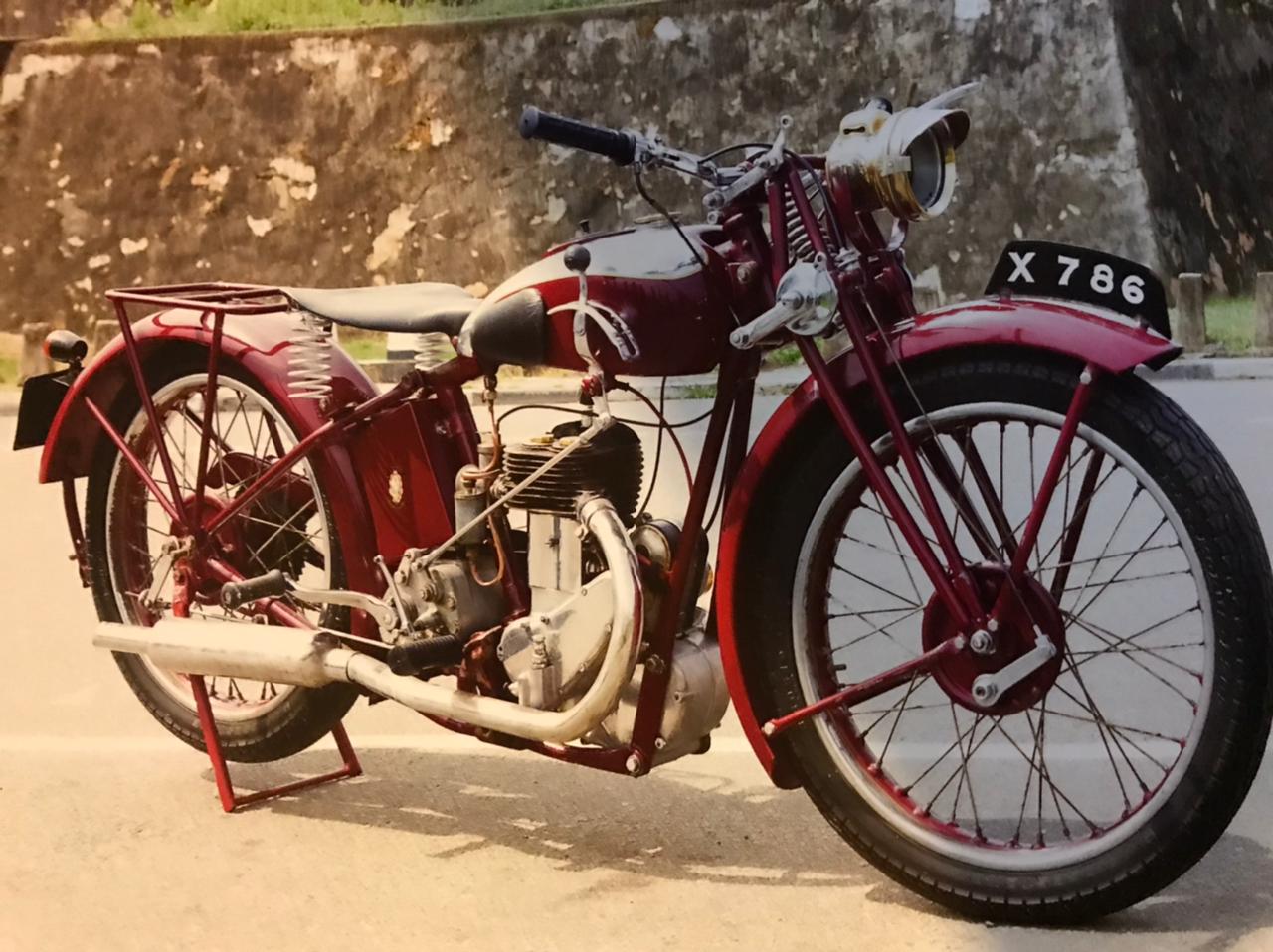The Birmingham Small Arms Company (BSA) was established in 1861 for the mechanized manufacture of guns. It went on to become a British industrial juggernaut producing everything from military and sporting guns, cars, bicycles, motorcycles and industrial machinery until its demise in 1979. BSA Motorcycle manufacture started in 1919. For a while the company had been producing bicycles, so when the requirement for arms slumped and the factories were laid up, motor-bicycles was seen as the way out At the Cycle and Motor Show in 1919 the BSA 3½ hp motorcycle made its and the company's motorized two-wheeler debut. The S29, also a 3½ hp, began life in 1929. The Company went on to produce a range of motorcycles and in the Second World War created a lightweight foldable motorcycle for use by Allied paratroopers. Post-war, the delightful BSA Bantam, a 2-stroke small capacity motorcycle, in essence a German DKW design, soon became synonymous with postal and telegraph organizations in a number of Commonwealth nations. X-786 arrived in Ceylon in 1929. After a period disuse, BSA S29 X-786 came into loving hands of Tillney Peiris (one-time Assistant Commissioner of the Motor Traffic Department of Ceylon), a pioneer in bringing vintage cars and motorcycles back to life. The bike went some years later to Farih Fauz, the founder president of the Vintage Car Club of Sri Lanka and is now part of the Akbarally collection.