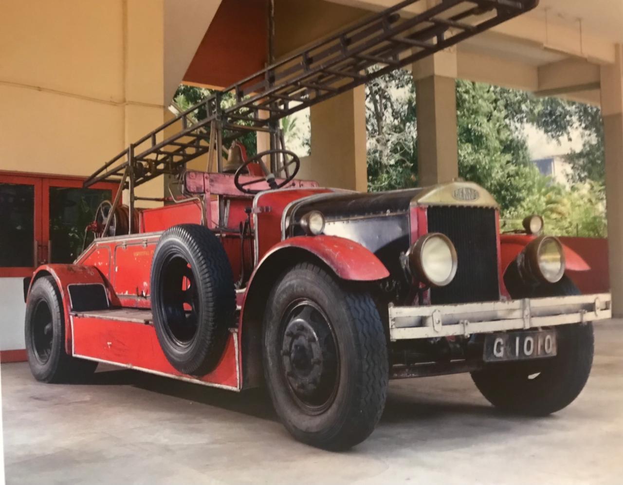 The Dennis marque was established in 1895 in Guildford , United Kingdom by the brothers John and Raymond Dennis , initially for the manufacture of bicycles . They expanded by making tricycles and quadricycles . The first motorized vehicle was built in 1898 , it was a tricycle fitted with a single - cylinder De Dion engine . Their first proper car , a 4 - wheeled 8hp model , was built in 1901. Later they moved into the production of commercial vehicles . In 1908 their first fire engine was built , which became their best known products . In 1972 the company was bought by the Hestair Group , later by Trinity Holdings in 1989 and by Mayflower Corporation in 1998. Today they specialize in fire engines and buses . Dennis fire engines and equipment were supplied to the Colombo Fire Brigade , Colombo Municipal Council , Kandy Municipal Council and the Royal Naval Yard , Trincomalee from 1916 . The Dennis Fire Engine featured is a 1929'G ' Type owned and preserved by the Kandy Municipal Council . It was despatched from Guildford in July 1929 with Chassis No. 7299 and Engine No. 33538. A small number of ' G ' Types were produced and only three known to be preserved in England .